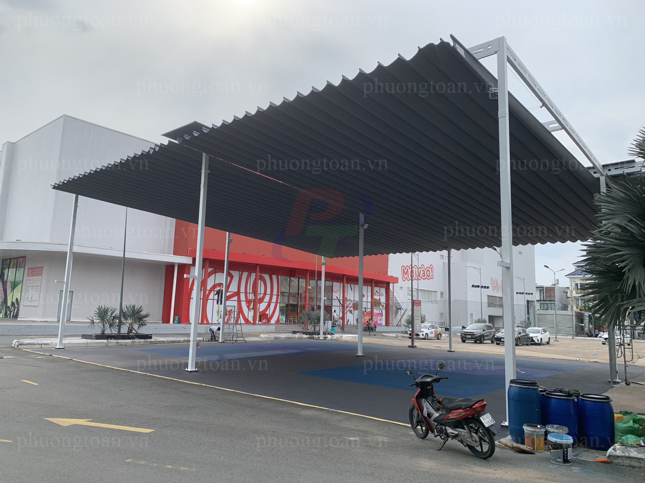 Ưu điểm: Có thể kéo ra khi trời nắng/mưa và thu gọn lại khi cần không gian thoáng đãng. Vải bạt Myung Sung Hàn Quốc có độ dày từ 0.38mm đến 0.62mm, rất bền bỉ.