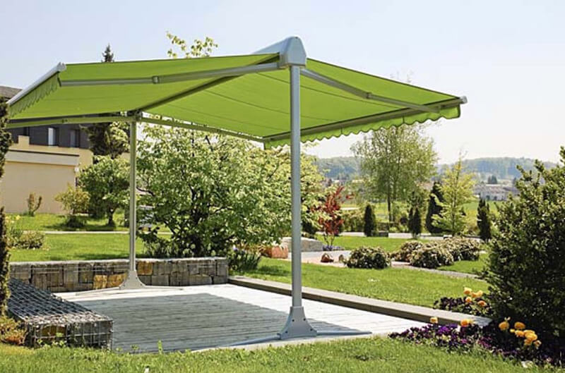 Mái che chữ A cố định thì phần khung trụ phía dưới được bắt cố định xuống sàn, trong khi phần mái hiên trên cao vẫn có thể thu vào kéo ra để không cản trở không gian, không cản gió và ánh sáng.