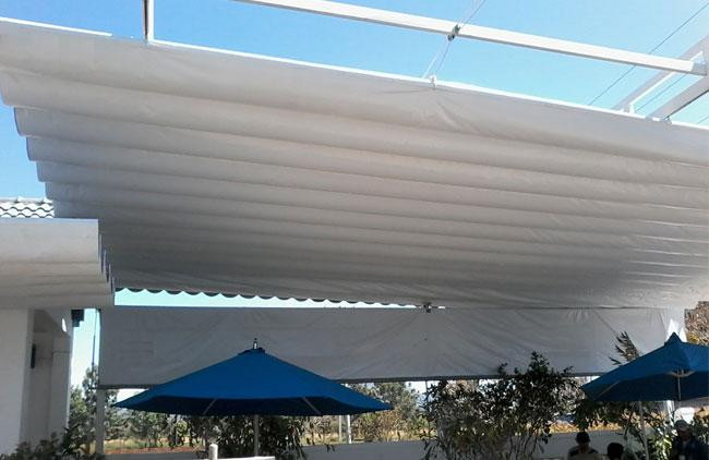 - Vải bạt làm mái che tự cuốn giúp che mưa nắng và tránh những tác động tiêu cực từ thời tiết.