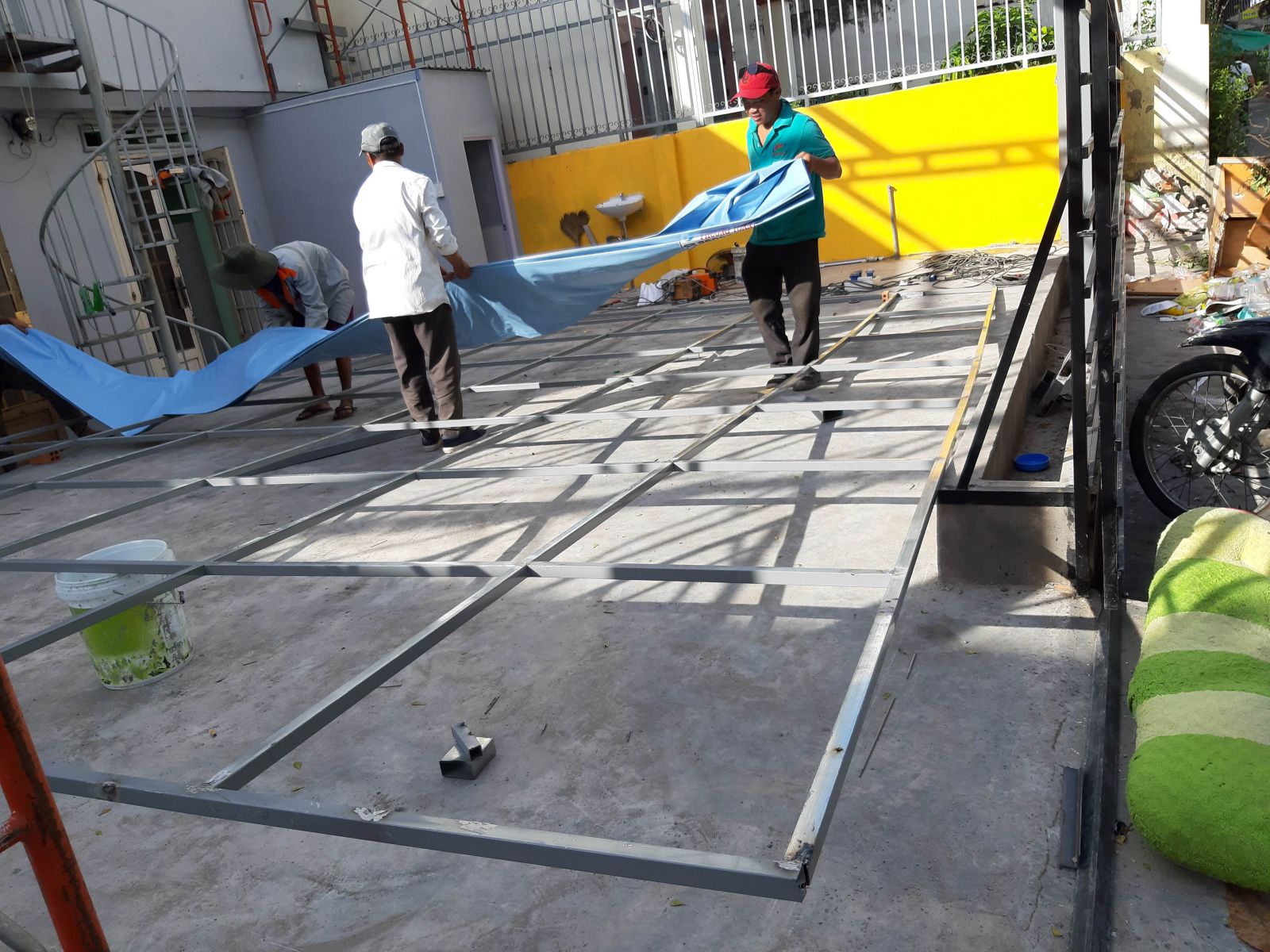 Gia công khung sắt chắc chắn. Sau đó căng bạt và bắn vít trực tiếp vào khung. Với cách này bạt ko cần may biên hay đóng khoen để tiết kiệm chi phí.