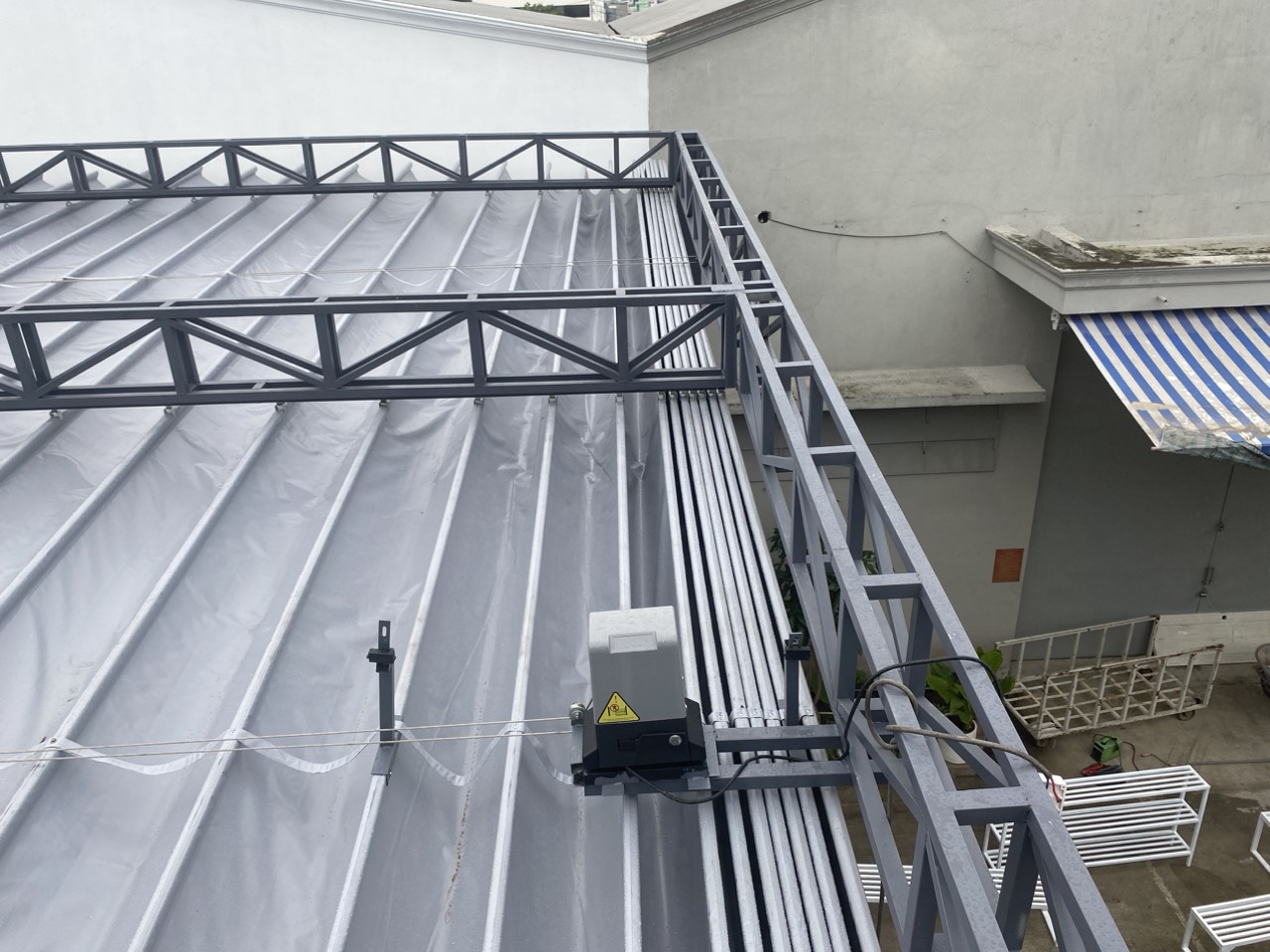 Tiết kiệm công sức: Đặc biệt hữu ích với những hệ thống mái xếp có diện tích lớn (hàng trăm mét vuông) vốn rất nặng nếu kéo tay.